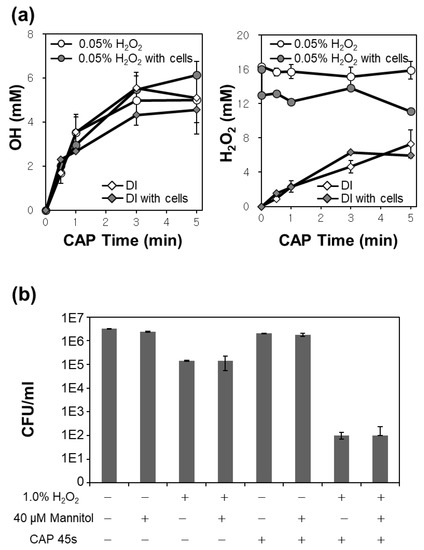 (a,b) Measurements of (a) OH· and H2O2 in the CAP treated DI or 0.05% H2O2 solution according to exposure time with and without bacteria; (b) CFU tests of E. faecalis with combinations of H2O2, mannitol, or CAP. The notations ‘+’ and ‘−’ mean the condition with and without each treatment, respectively.