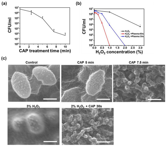 Bactericidal effects of CAP on the bacterial suspension compared with H2O2; (a) A graph showing CFU decrease according to plasma treatment time; (b) A graph showing CFU decrease according to H2O2 concentrations with or without CAP treatment; (c) SEM images of the bacteria treated with CAP, H2O2 and CAP together with H2O2. Scale bars are 400 nm.