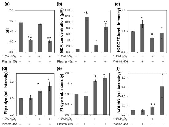To find the cause of the synergistic bactericidal effects, some important factors related to cytotoxicity were measured. The pH of the solution was measured after CAP treatment (Figure 4a). pH is a very important factor in determining bacterial membrane potential and disinfection efficiency [17]. Since H2O2 is acidic, the pH of 1% H2O2 solution was initially slightly lower than that of DI water. It was dramatically reduced with CAP treatment, and more reduction was observed with combination treatment. However, the pH values were not significantly different between CAP only treatment and CAP with H2O2 treatment.
