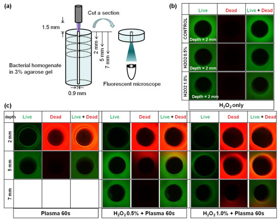 To visualize the bactericidal effects of CAP in a tissue, agarose gel was utilized for easy molding. Agarose with low gelling temperature (A9414, Sigma-Aldrich, Burlington, MA, USA) was made as 6% gel solution and mixed with one volume of E. faecalis bacterial solution. The mixture was put in 2 mL Eppendorf tube and gelated in the ice. During gelation, a syringe needle whose outer diameter was 0.9 mm was put inside gel to mold a thin and deep hole for pointing the CAP treatment center and easy manipulation. The end of the quartz tube was located above 1.5 mm from the gel, and CAP was applied for 1 min. To investigate the effects of H2O2, the gel was put inside H2O2 for 5 min before CAP treatment. Solutions of 0.5% and 1.0% H2O2 were used, which were sublethal and lethal conditions in vitro, respectively. Then, the gel was cut perpendicularly to the hole at depths of 2, 5, and 7 mm from the top where the CAP contact position was. The part of gel was stained with Live/Dead bactolight staining kit (L7012, Thermo Fisher Scientific), and the cross-section was observed by using fluorescence microscopy (Ti-U Eclipse, Nikon, Tokyo, Japan).