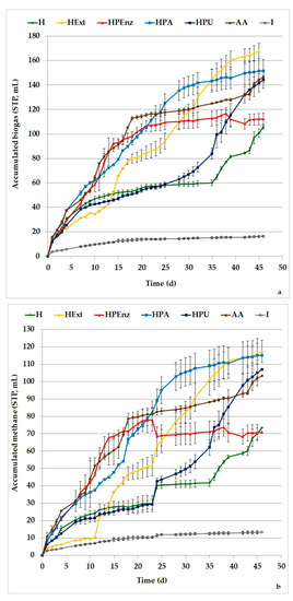 Biogas production was observed from the beginning in all the substrates tested, with no lag phase evidenced, as shown in Figure 1a. After the first week of the trial, the difference in the biogas production capacity of the tested substrates began to be noticed, and after 25 days it was possible to observe three distinct levels of accumulated biogas volume, namely: 125, 118, and 110 mL (HPA, AA, and HPEnz, respectively); 94 mL (HExt); and 59 mL (H and HPU). However, from this point onwards, the biogas volume collected in HExt increased the most, evolving positively over time until it equaled the volume recorded in HPA at 35 days of the trial (144 mL). The successive increases in the biogas volume in this unit suggest that the material being digested—the extracted heterotrophic alga (HExt)—was degraded in a more phased and gradual way throughout the experiment, compared to the others, but achieved the highest biogas volume (168 mL).