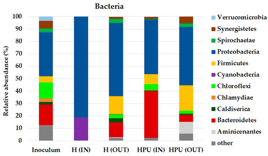 After NGS, the samples created between 600,188 and 837,438 raw sequence reads, corresponding to sample H (OUT) and to the inoculum (I), respectively. Table 5 shows a total of 1,074,985 sequences (1,068,111 bacterial, 6850 archaeal, and 24 unassigned) which were recovered and analyzed. A total of 3224 operational taxonomic units (OTUs) that comprised libraries were detected in each sample.