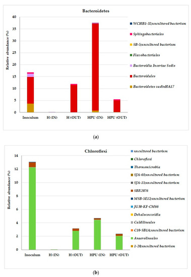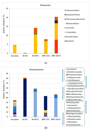 The inoculum shows the predominance of Bacteroidales (11%, Figure 3a), Anaerolineales (12%, Figure 3b), and Clostridiales (4%, Figure 3c), and the presence of members of all classes of the phylum Proteobacteria (Figure 3d), with dominance attributed to α-Proteobacteria (9%), β-Proteobacteria (11%), and δ-Proteobacteria (9%). The predominant populations in H (IN) units were Pseudomonales (77%, Figure 3d). After AD, a change was observed in the microbiota composition. Although the predominance of Proteobacteria remained, this phylum decreased to 59% (Figure 2) and became mainly constituted by Rhizobiales (39%, Figure 3d). Simultaneously, Bacteroidales (11%, Figure 3a) increased together with Clostridiales (10%, Figure 3c) in the bacterial populations, which is in line with what has been detected by other authors as the main bacterial populations present in anaerobic digesters [38]. The role of most members of these microbial populations is crucial in acid and acetogenesis since they can convert amino acids, sugars, and alcohols into volatile fatty acids.