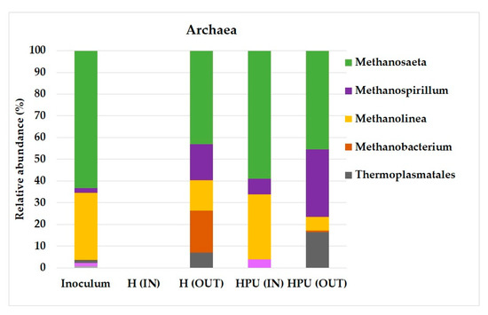 All archaeal sequences were assigned to the phylum Euryarchaeota. Like the bacteria domain, the archaea domain also shows lower diversity (0.0 and 2.68, Table 5) in the samples for H (IN) and HPU (IN) units, respectively. The inoculum shows a predominance of Methanosaeta, with a relative abundance of 63% of the total archaeal sequences, and Methanolinea (31%). Despite no archaeal sequences being detected at the beginning of the AD in H units, Methanosaeta, an obligate acetoclastic methanogen, became the comparatively dominant genus at the end of the anaerobic digestion (43% of archaeal sequences, Figure 4), and kept the dominance in HPU units (45%), meaning that the methane produced was formed through acetoclastic methanogenesis as the main pathway [43,44,45]. However, the relative abundance of the hydrogenotrophic methanogens—that preferentially use H2/CO2 instead of organic acids as substrate, in both H (17% Methanospirillum and 19% Methanobacterium) and HPU units (31% Methanospirillum)—shows that a good balance has been set up in the population, capable of avoiding acidification of the medium and efficient in using all available substrates to convert them into methane. The acclimation behavior in HPU units shown by the microbial diversity index of methanogens (Table 5) explains the higher cumulative methane yield (263 L CH4/kg VSin) obtained in this assay compared to H units (180 L CH4/kg VSin).
