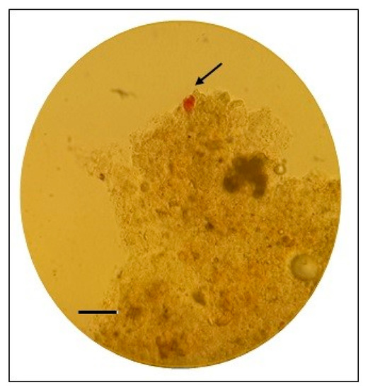 Figure 5. A liquid sample of culture medium observed under an optical microscope. Bar, 5 µm. The black arrow shows the reddish-like clusters that contain pigmentation.