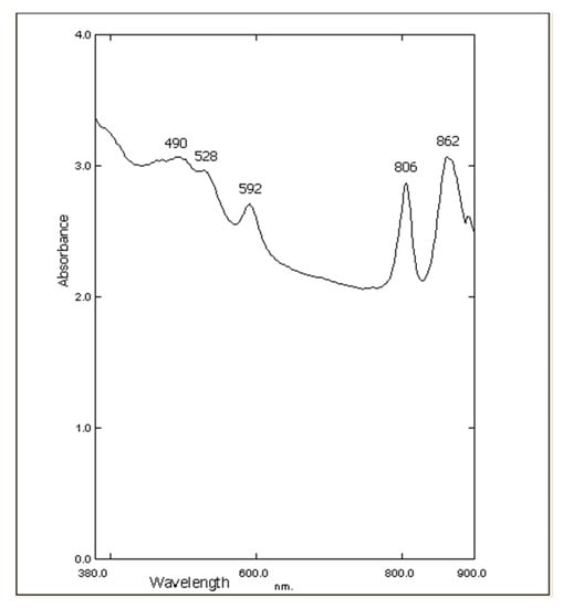 Figure 6. Absorption spectrum of the whole-cells sample. The wavelength (nm) of the absorption maxima is shown at the top of the peaks.