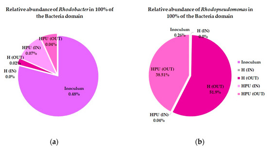Figure 7. Relative abundance (%) in total bacteria sequences, in each sample collected from inoculum, H, and HPU units, for the taxonomic classification of bacterial reads at (a) Rhodobacter and (b) Rhodopseudomonas genus level.
