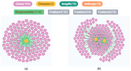 Graph representation of the feature set: (a) Multiple genes responsible for a single disease; (b) involvement of similar genes in one or more diseases; (c) relation between multiple genes in selected diseases and normal human beings concerning extracted features for respective genes.