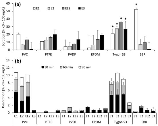 Plastic and rubber materials or materials with a polymeric coating [1] are currently used in various applications, including laboratory or technological equipment. Except for disposable items (pipette tips, vials, containers, gloves, etc.), many of these materials are designed for repeated use, such as instrument hoses. Tubing materials are desired to be durable, inert and resistant to mechanical and chemical irritation, especially in applications such as advanced oxidation processes (AOP), where specific oxidative and irritating conditions can occur [2,3,4]. In addition to chemical resistance, resistance to fluctuating and abrasive process conditions, thermal conductivity, fabrication capabilities and design play significant roles in the decision-making process. Nevertheless, when used in contact with hydrophobic compounds, their polymeric nature poses a risk of contamination. Unwanted sorption (adsorption/absorption) and desorption events of trace amounts of organic pollutants can cause severe discrepancies during sample handling and analyses [5,6], especially when only trace and environmentally relevant quantities are present. Among factors that contribute to sorption may be the ability of a micropollutant to interact specifically with polymer functional groups, Gibbs free energy of the localized environment, and other factors. Moreover, the sorption could be enhanced by the surface roughness and microporosity of the polymer material. Due to the predominantly hydrophobic nature of many organic pollutants, polymeric materials are expected to interact with them through weak hydrophobic interactions, van der Waals forces or noncovalent interactions [5,7,8]. Between them, natural estrogenic hormones, such as estrone (E1), 17β-estradiol (E2), estriol (E3) and synthetic contraceptive 17α-ethinylestradiol (EE2) are emerging micro-pollutants established in the Watch List of Substances for European Union-wide monitoring reported in the Decision 2015/495/EU of 20 March 2015 [9] and US EPA [10]. Due to their hydrophobicity values expressed as log Kow (see Table S1) and the high-risk coefficients, estrogens represent relevant model compounds [11,12]. They are released into the environment via wastewater-treated effluents as they are poorly removed with conventional wastewater treatment plant (WWTP) processes [13,14,15,16]. Various studies have reported their occurrence in aqueous and solid environmental matrices and tap water [17,18,19,20,21]. Although their concentrations in the environment were found in the ng/L range, they show high estrogenic potency. The presence and persistence of estrogens in the environment raise concerns regarding the potential adverse effects on the sexual and reproductive systems of wild animals, fish and humans [22,23,24,25,26]. The ability of estrogens to sorb onto the surfaces of various materials is used for their removal from the environment [27,28,29,30,31]. On the other hand, the sorption and following desorption of such chemicals can be a source of problems. For example, due to organic carbon as a sorbent (e.g., humic acids), they can reach deeper layers of soil (possessing divergent conditions), where they can be desorbed and thus contaminate groundwater [26,32]. Similarly, plastic waste [33], especially microplastics [34,35] as an important part of current environmental pollution, can serve as a source and vector for various chemicals in aquatic and terrestrial environments. The sorption of estrogens can also be a source of inaccuracy in analysis, especially when their concentrations are very low, as is usually the case in environmental samples. If estrogens sorb to the sample handling material or materials used for sample filtration, the results may be significantly underestimated or false negative [5,25]. In addition, if they sorb to coupling material in AOP units, better degradation efficiencies may be falsely attributed to sorption.