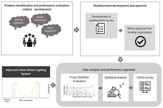 Nine sub-criteria (PIs) were developed and grouped under three primary criteria, including design functionality, visibility adequacy, and driver satisfaction level, through literature and group discussions. Figure 1 illustrates the hierarchical-based assessment approach used to assess the efficacy of the USLS developed in the present study. In the subsequent step, a questionnaire survey was developed to assess drivers’ opinions of each sub-criterion, where each sub-criterion was translated into a question statement. An online survey was sent to the number of respondents as per the calculated sample size. Statistical analyses were performed on the obtained responses to evaluate the significance of the sub-criteria. Lastly, the fuzzy synthetic evaluation (FSE) method assessed the performance of the street-lighting system in the study area by aggregating the sub-criteria and the primary criteria.