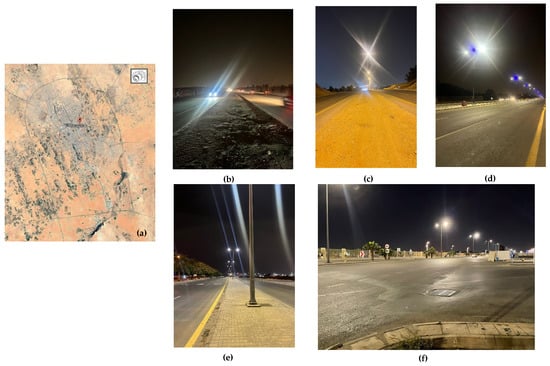 Buraydah City is the capital of the Qassim region, which is located at the center of Saudi Arabia. The city accommodates around 50% of the region’s population []. Being the largest city, Buraydah serves as the economic, social, and cultural hub of the region. Qassim region experiences a high traffic crash rate, much like other parts of KSA, primarily due to over-speeding, driver carelessness, use of mobile phones, violations of traffic laws, and inappropriate street-lighting [,]. With a large fraction of nighttime crashes in Buraydah, the MoQ is keen to know the effectiveness of street-lighting. Hence, the residents of Buraydah, being the primary road users, were considered for the performance appraisal of the USLS. Figure 2 illustrates the location of the study area and some images showing the city’s street-lighting condition.