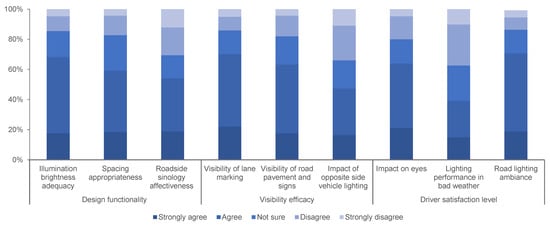 Questionnaires have long been a favored method of gathering data in subjective studies [,]. The method was found appropriate for the present research’s objectives about streetlights and the characteristics of the luminaire’s examination. In an effort to supply proof of the current street-lighting environment, a questionnaire survey investigated drivers’ opinion about the effectiveness of the existing USLS in Buraydah City. A questionnaire with nine closed-ended queries with multiple-choice response possibilities was developed based on expert validation for the targeted research objectives. All the questions were unambiguous and direct, and a set of answers was given to respondents, which provided the plausibility to select only one answer out of the five choices: “strongly agree”, “agree”, “not sure”, “disagree”, and “strongly disagree”.