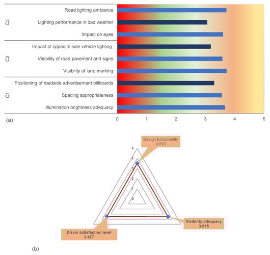 The Qassim Region reported one of the highest traffic crashes in Saudi Arabia with an increase in fatalities of 24.3% in 2022, which is one of the highest increases in the Kingdom []. The situation demands all sorts of road safety measures, including improved USLS. Performance evaluation criteria to appraise the performance of USLS were developed from the literature and based on expert judgment. The first criterion (C1), “design functionality”, was assessed by three sub-criteria, including illumination brightness adequacy (SC11), spacing appropriateness (SC12), and positioning of advertisement boards (SC13). Figure 6 shows that the performance of SC11 was “medium to high”, with a crisp performance score of 3.67. Past studies have reported good technical functionality of the thermal and electrical design of LED technology []. As almost 90% of the roads of Buraydah City have been installed with LED, the performance is expected to improve with complete LED-based street-lighting. Most of the respondents found the spacing between the poles appropriate, which resulted in a “medium to high” performance (3.56) of SC12. The distance between the two poles of light is 2.5 to 3 times the pole’s height in Buraydah City, which is a global standard []. The minimum score of 3.13 of SC13 shows some inappropriate positioning in the densely populated areas (also see Figure 2). Both the frequency and duration of fixations were reported higher in the case of electronic billboards, in comparison to other signs installed along the roadside [,]. The overall “medium to high” performance of C1 suggests a need for improvement, particularly regarding the locations of electronic billboards.