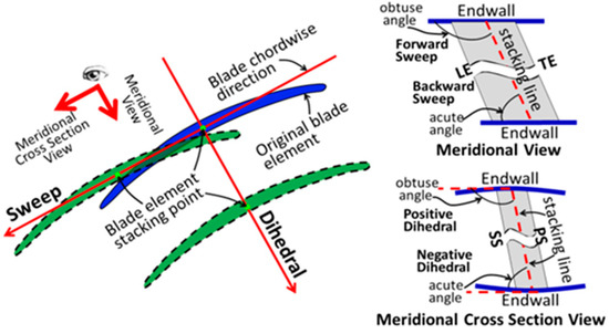 This paper employs the widely used Sweep-Dihedral Coordinates to define the 3D blading parameters [25,29,30]. As shown in Figure 1, the displacement of the blade section in the chordwise direction is called “sweep”. Meanwhile, an obtuse angle between the endwall and leading-edge stacking line in the meridional plane is defined as a forward sweep. On the other hand, the displacement of the blade section in the direction perpendicular to the blade chordwise is called “dihedral”. Similarly, an obtuse angle between the endwall and blade stacking line in the meridional plane designates a positive dihedral, and vice versa.