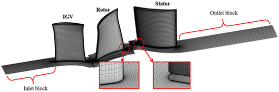 The cantilevered stator to be investigated comes from the aft stage of a highly loaded high-pressure compressor, whose hub clearance is constant at 1% blade height. As shown in Figure 2, The numerical simulation is performed under the stage environment, with the simulation domain containing three blade rows: the IGV, the rotor, and the stator. The domain inlet is 2.0 times the chord length upstream of the IGV, while the domain outlet is 3.5 times the chord length downstream of the stator blade. The structured grid was generated using NUMECA Autogrid5; the main blade region and the clearances adopt the O4H topology and the H-O topology, respectively. Moreover, the grid is clustered at the near-wall region to satisfy the requirements of the turbulent model; y+ of the first grid off wall is about 2.5 in the region close to the transition position, and the number is smaller near the trailing edge. After grid independence analysis with grid density, the total grid number for the rotor and stator blade rows was 1.28 million and 1.45 million, respectively [31,32]. For a 1.5-times finer mesh, the variation of the loss, the static pressure rise coefficient, and the flow angle compared with the selected mesh is less than 0.1%.