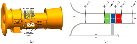 To check the effect of the 3D blading technique, a cantilevered stator in the existing test facility was redesigned and measured experimentally to reveal the variations of the flow field. The experiment was conducted in the low-speed large-scale axial compressor (LSLSAC) test facility at Beihang University. As shown in Figure 3a, the LSLSAC, whose hub-to-tip ratio is 0.75, adopts the 1.5 stage configuration, with a row of inlet guide vanes. The rotor and stator blades are nearly radially stacked by the controlled diffusion airfoil (CDA). The rotating speed is 1100 rpm, which is the same as the numerical simulation. At the design point, the stage loading coefficient is approximately 0.46 (based on midspan velocity), whereas the nominal rotor tip clearance and stator hub clearance are 1.5% and 1.0% blade height, respectively.