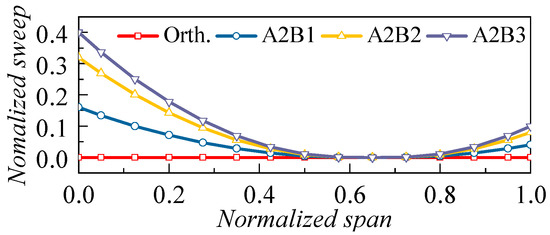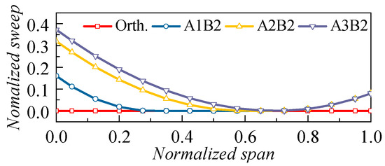 To investigate the influence of the sweep angle, the design schemes A2B1, A2B2, and A2B3 are compared in this section, as illustrated in Figure 9. A tip region of each case employs the forward sweep at the 70% span with the same sweep angle as the hub. The orthogonal/straight blade works as the benchmark of comparison.