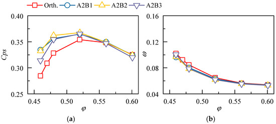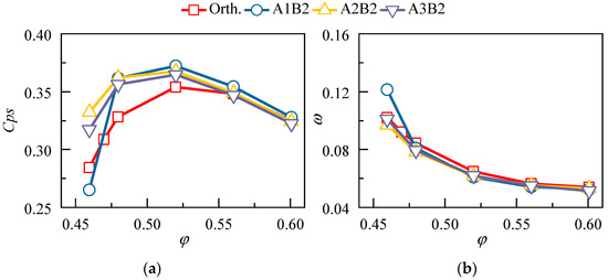 The influence of sweep height is first compared using the control variate method. As shown in Figure 4, the design schemes are A1B2, A2B2, and A3B2. A slight forward sweep is also adopted at the tip region to balance the pressure gradient in the radial direction (135°, 70% span). Results are compared to the orthogonal/straight blade (Orth.). Note that no dihedral is utilized in this section.