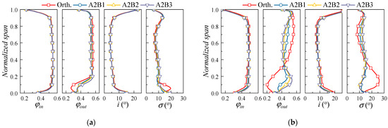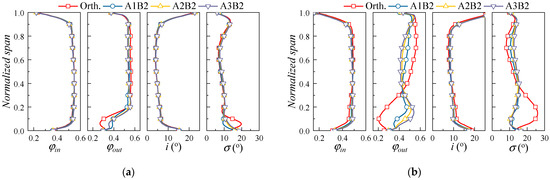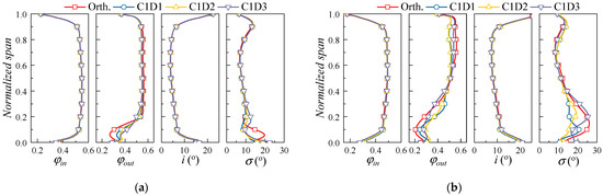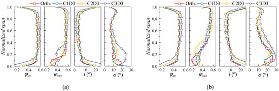 The radial distribution of the aerodynamic parameter for the cases with different sweep angles is given in Figure 12. Results of both the φ = 0.52 and the φ = 0.46 conditions are provided. With the increase of sweep angle, the flow coefficient at the hub region increases, resulting in the improvement of the flow capacity. On the contrary, the flow capacity at the upper span parts is decreased, corresponding to the widening of the blade wake in Figure 11. The influence of the sweep angle on the radial flow of the blade is more significant at small mass flow rates. Considering the influence of the sweep angle on the corner flow and the blade separation flow, a moderate sweep angle (approximately 135° for the present study) is appropriate for the cantilevered stator.