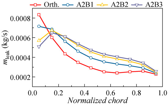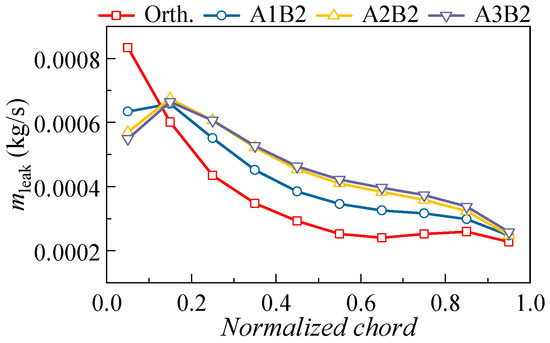 To reveal the effect of sweep height on the leakage flow, the variation of the mass flow rate of the leakage flow is presented in Figure 8. Results indicate that the leakage flow rate first decreases in the areas between 0~20% blade chord and then continues to increase toward the trailing edge. The increase in the mass flow rate of the leakage flow will enhance the removal of low-energy fluid in the corner region of the blade suction surface, thus confirming the former analysis. Additionally, although increasing the sweep will enhance the 3D blading effect, the leakage characteristics of the A2B2 case and the A3B2 case exhibit similar patterns; hence, further increasing the sweep height will result in less benefit.