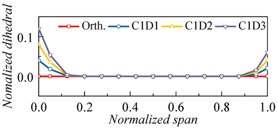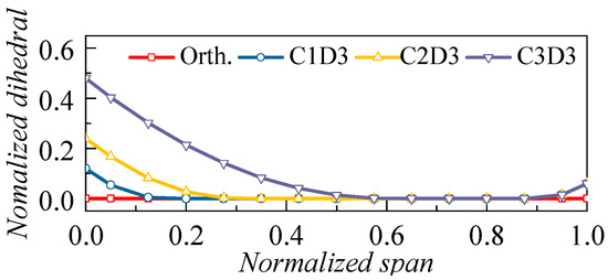 Likewise, the influence of dihedral height is first compared using the control variate method. As shown in Figure 14, the design schemes are C1D3, C2D3, and C3D3. A slight positive sweep is also adopted at the tip region (150°, 90% span). Simulation results are compared to the orthogonal/straight blade (Orth.); note that no sweep is utilized in this section.
