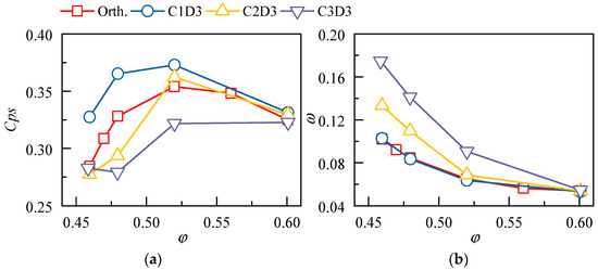 The pressure rise and loss characteristics for the design schemes with different dihedral heights are demonstrated in Figure 20. The influence of the dihedral is more pronounced in terms of pressure rise coefficient and at small mass flow ratios. In comparison to the orthogonal blade, the positive dihedral will always improve the blade static pressure coefficient, whereas the increment will first increase and then decrease with the increase of the dihedral angle. The optimum dihedral angle in the present study is 135°, where the value of Cps is improved by 23.5% at the near-stall condition.