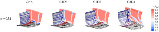 To determine the reason why increasing the dihedral height will reduce the stator performance, the flow field distribution was established for the cases with different dihedral heights, as presented in Figure 16. Results at the mass flow coefficient of 0.52 demonstrate that the positive dihedral will not only push the trajectory of the leakage vortex away from the blade suction surface but also promote the radial migration of the low-energy fluid. In scheme C1D3, the dihedral height is relatively low, and the accumulation of low-energy fluid at the corner region of the blade suction surface is reduced by the circumferential migration of the leakage flow. Therefore, the blockage at the blade outlet is alleviated significantly. With the increase of the dihedral height (C2D3), although the corner separation at the stator hub is weakened effectively, the wake in the lower and middle parts of the blade is elongated and widened remarkably, which is detrimental to the comprehensive aerodynamic performance of the cantilevered stator. Moreover, if the dihedral height is further increased to 60% (C3D3), the leakage flow will undergo an obvious radial migration under the strong blade force. As a result, the separation at the blade trailing edge will be significantly enhanced, and the performance of the cantilever stator will further deteriorate. Note that with the decrease of the mass flow coefficient, the influence of the dihedral amplifies substantially.