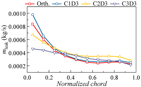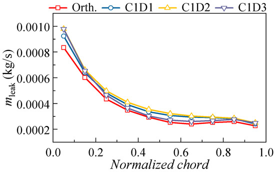 Figure 18 presents the variation of the leakage mass flow rate. An interesting phenomenon is that increasing the dihedral height will first increase and then decrease the leakage mass flow rate at the blade leading edge. Consequently, the uniformity of the leakage flow characteristic along the blade chord is first decreased and then increased. Moreover, although the slight positive dihedral (C1D3) could increase the mass flow rate of the leakage flow along the axial direction, increasing the dihedral height will incur a significant reduction of leakage flow at the blade leading edge, thus weakening the effect of the 3D blading technique.