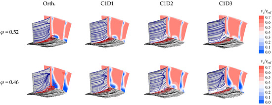 The flow field distributions at the mass flow coefficients of 0.52 and 0.46 are given in Figure 21. It is apparent that the leakage flow will deviate from the blade suction surface with the increase of the dihedral angle. As a result, the mixing of the leakage flow with the mainstream is more sufficient, and the blockage at the outlet alleviates. However, the increase of the dihedral angle will also enhance the radial migration of the blade corner flow, thus strengthening the flow separation on the suction surface. Of all the design schemes, C1D2 could not only suppress the secondary flow at the hub endwall but also avoid excessive flow separation on the blade suction surface, hence obtaining the optimum aerodynamic performance.