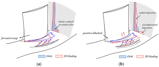 Three-dimensional blading can improve the compressor aerodynamic performance through reorganization of the flow field and hence is widely used in axial compressors. In general, 3D blading can be classified as sweep and dihedral. It is well known that the forward sweep of the rotor blade tip can reduce the local inlet Mach number, thereby weakening the shock wave and reducing the loss [7,13,15,16,17,18,19,20]. The sweep of the blade can also be used to control the corner flow in the subsonic compressor. As for the dihedral, it is recognized that the positive dihedral can construct a radial pressure gradient in the blade passage, thereby weakening the accumulation of the boundary layer at the corner region and inhibiting the occurrence of flow separation. According to the research of Breugelmans et al. and Weingold et al., the positive dihedral at both ends of the blade can reduce the endwall loss but will increase the loss in the midspan areas [21,22]. Sasaki further notes that the beneficial effect of positive dihedral on the near-wall region is mainly related to the dihedral angle, whereas the negative effect at the midspan is determined by the dihedral height [23]. More information on 3D blading can be found in references [24,25].