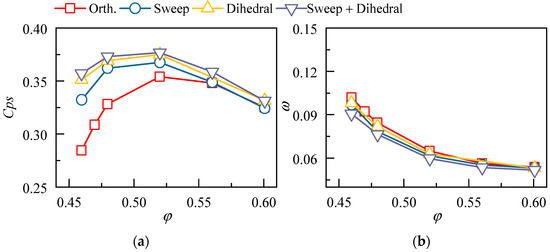 Radial distribution of aerodynamic performance for the cases with different sweep angles. (a) φ = 0.52; (b) φ = 0.46.