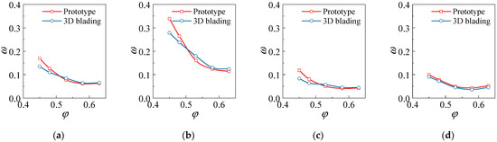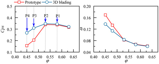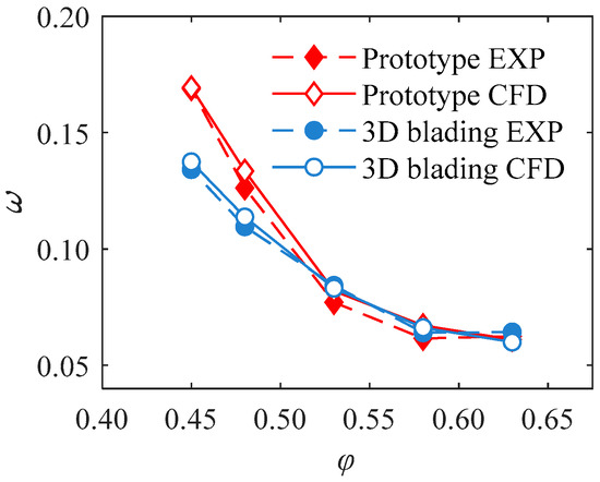To start, the overall aerodynamic performance of the compressor stage is compared, as shown in Figure 30. Results highlight that the 3D blading on the cantilevered stator could significantly improve the performance of the compressor stage at small mass flow conditions; at the near stall condition (P4), the total pressure rise coefficient and the efficiency are increased by 3% and 2%, respectively. However, as the operating point moves to the right, the 3D blading will start losing its advantage, and the stage efficiency at φ > 0.51 will even drop by 0.7%. As only stator blades have been changed, Figure 31 shows the loss characteristics of the cantilevered stators, in which the CFD results are also plotted to present the deviation between the experiment result and the CFD result. Figure 31 indicates the CFD results have high reference value, so the above numerical analysis results are credible.