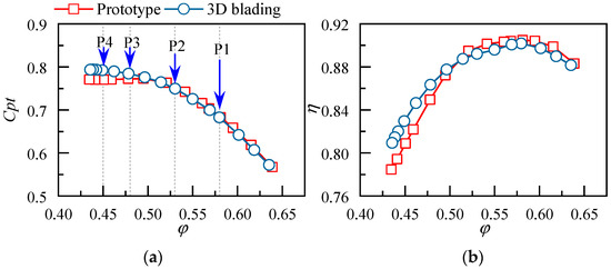 Comparison of performance characteristics of the compressor stage: (a) total pressure rise coefficient; (b) efficiency.