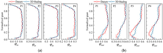 The radial distribution of mass flow coefficients under different operating coefficients: (a) inlet mass flow coefficient; (b) outlet mass flow coefficient.