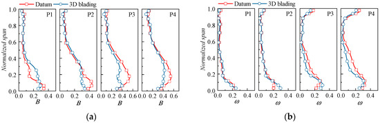 Figure 34 presents the distributions of the blockage coefficient and the total pressure loss coefficient. The variation of the blockage denotes that the 3D blading could generally relieve the flow blockage at the hub corner, thereby creating a healthier flow field. However, the blockage coefficient of a 10~40% span is increased at the P1 condition, which corresponds to the reduction of mass flow ratio in Figure 33b. As for loss characteristics, large amounts of loss reduction are brought by the 3D blading at small mass flow conditions (P3 and P4), whereas the beneficial effect is less distinctive at large mass flow ratios (P1 and P2).