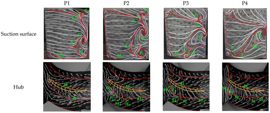 To obtain an overview of the flow structures in the cantilevered stator, Figure 35 presents the oil-flow results of the datum stator. The separation line (SL) is denoted by the red solid line, the attachment line (AL) is denoted by the red dotted line, the spiral node is denoted by the letter F, and the saddle point is denoted by the letter S. It can be seen that at the P1 condition, under the blowing effect of the endwall leakage flow, the corner separation at the stator hub starts from the saddle point S1 and separates into S1-F1 and S1-F3 along the radial direction; the tip region also suffers corner flow separation. The upper and lower separation areas bounded by S1 are approximately symmetrical and located close to the blade trailing edge, whereas the separation region at the blade tip is independent of the hub corner separation. With the decrease of the mass flow coefficient, the corner flow separation first enlarges its radial scale at P2 and then changes the topology at P3: the separation line S1-F1 heads upstream, pushing F1 to the endwall and incurring the corner stall. According to Figure 35, the stator hub is severely blocked at the P3 condition, represented by the large-scale low-speed zone at the outlet. Further observation of the tip flow shows that at the near-stall conditions (P3, P4), the separation region at the stator hub and the tip will gradually merge at the trailing edge, which is also demonstrated in Figure 35. Finally, under the cantilevered geometry, the occurrence of the corner stall will only induce local separation flow at SL2, which is distinctively different from the conventional shrouded stator (represented by the large-scale endwall separation and a rapid expansion of the separation zone) [37,38,39].