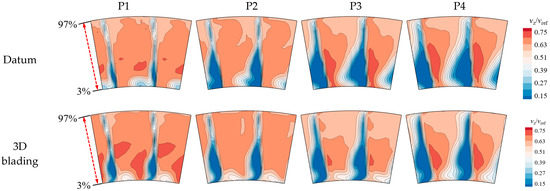 As shown in Figure 28, the comparison of the flow field under different operating conditions (P1~P4, see Figure 27) indicates that the datum stator suffers from severe corner flow separation at the near-stall condition, leading to the sudden drop of the pressure rise capacity. Meanwhile, the utilization of compound sweep and dihedral reorganizes the flow field; hence, the accumulation of low-energy fluid at the hub corner is relieved significantly, corresponding to the performance improvement in Figure 27. Note that the flow separation in the upper span areas is intensified in comparison with the datum scheme, which is due to the radial migration of the low-energy fluid from the positive dihedral.