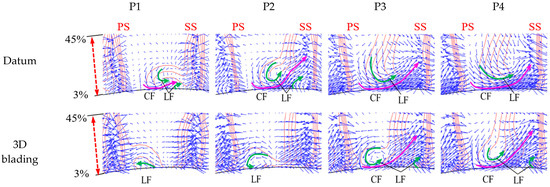 To further reveal the mechanism of 3D blading in the corner flow in the cantilevered stator, Figure 37 presents the comparison of the secondary flow velocity vector at the stator outlet. Traces of the secondary flow (CF) and the leakage flow (LF) are depicted to demonstrate the flow structures with better clarity. Apparently, the leakage flow that travels from the blade pressure surface to the suction pressure surface could hinder the circumferential migration of the secondary flow. In the datum scheme, the CF travels through the bottom of the LF and climbs to the blade suction surface, inducing a counterclockwise vortex on its left side and a clockwise vortex on its right side. Upon the utilization of 3D blading, the strengthening of the leakage flow enhances the inhibition effect of the LF on the CF, leading to secondary leakage at the P1 and P2 conditions. As for P3 and P4 conditions, the flow separation in the corner region is reduced, owing to the weakening of the secondary flow.