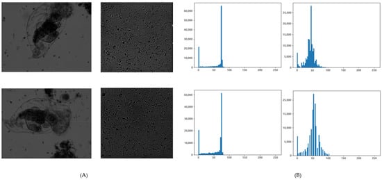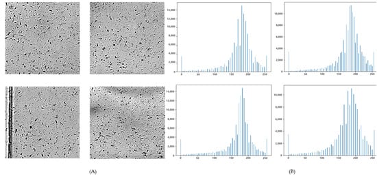 1000× zoom microscopy image with limited histogram and histogram graph, N = 10: (A) four microscopy image samples; (B) Histograms corresponding to each image sample..