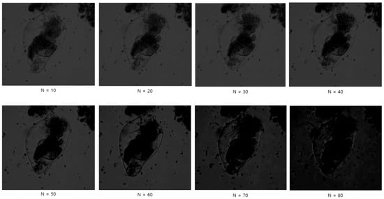 Most objects have different internal opacities depending on their density, and some have color due to other internal and external factors. Objects have various characteristics, but the most obvious characteristic with the highest influence in a given environment is that most of the inner area of the object has a slightly lower value than the background. As a result of running multiple experiments on the image used in the test in this study, the ideal value of N, which most clearly changes the pixel value of an object to 0, was set to 10 percent. Figure 2 shows the captured images after applying the modified SCB algorithm in accordance with the different N values used in the multi-run experiment.