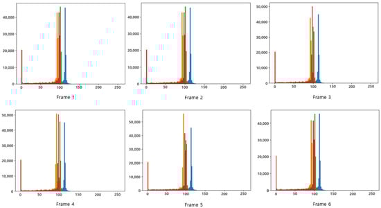 Using this characteristic, the histogram normalization range of the normalize function is limited to 0~P[avg] so that the background and object can be more clearly separated in the SCB algorithm. The result can be seen in Figure 3. At this point, the polarization of the object and the background proceeds, so even if the shapes of the graphs in Figure 3 are slightly different, there is no significant difference in their meaning. In the end, even if you do not go through the entire process proposed by the original SCB, you can separate the area of the object and then combine the matrices for each of the R, G, and B channels through the normalization function again. Then, the gray scale function is applied to the corresponding image. As can be seen when comparing Figure 3 and Figure 4, even if the histogram is restricted and normalized, there is no significant change in the graph shape of the original image and the normalized image. As shown in the graph in Figure 4, gray scale images can be flexibly applied even in situations where the P[max] of a specific channel is high due to the presence of a region biased toward a specific color in the image. Therefore, we did not use a single channel, but used a gray-scaled image. Finally, binarization is performed in the next step using a two-dimensional matrix that has been gray-scaled.