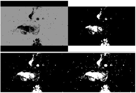 Microscope images (1000× zoom) with binarization (top left: SCB only, top right: 1/4, bottom left: 1/2, bottom right: 3/4).
