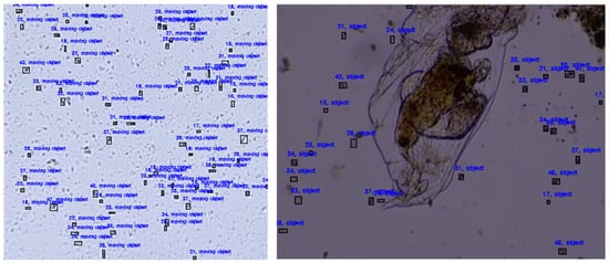 In order to accurately find the object of interest through the method proposed in this study, we used a method of pre-defining the size of the object to be detected. In the case of an image at 300× magnification in Figure 6, the captured area is 0.3 mm wide and 0.3 mm long. Using this value, it is possible to inversely calculate the size of the floating object in the image. In the case of the 1000× magnification image in Figure 6, the size of the floating object can be estimated through the average size value of the bacteria present in the image. Floating objects in the image of Figure 6 are the results of detecting objects with a size between 10 and 60 in this way. We drew a blue box around the object using the detected object’s center coordinate value and wrote the object’s size and description in the upper left corner.