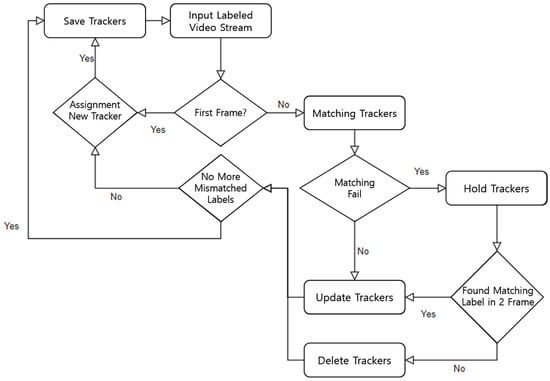 For this, we used the connectedComponentsWithStats function provided by OpenCV. Using this, we proceeded to label the areas with the size suggested in Section 3.3 among the white areas obtained in Section 3.2. In the first frame, a tracker was allocated to the labeled areas, and then in the next frame, labeling was applied in the same way. Among the areas to which the label was applied, the area determined to be the same object as the one found in the previous frame was stored in the corresponding tracker. The tracker defines the state of the object based on the information of the labeled area allocated to each frame, and the details of the information can be checked in Table 2.