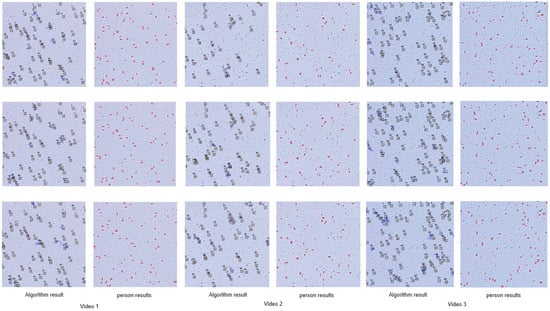 In the reference comparing the cases of F-RCNN(1) and YOLO, it was mentioned that each method takes 32 fps and 20 fps [5]. When 1 s is 30 fps, it can be seen that 32 fps and 20 fps are converted to 1.06 s and 0.66 s, respectively. For R-CNN, it was stated that the average detection time of the photos used in the test was 0.14 s, but it was only written for a single object [16]. When F-RCNN(2) was used, it was said that particles with a higher mobility were detected within 1.12 s [15]. Lastly, our proposed algorithm had an average processing time close to 0.02 s, indicating that it is relatively improved in real-time processing compared to other proposed machine-learning methods.