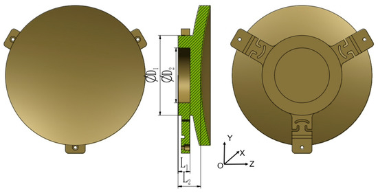 where (μm) is the maximum deformation of the mirror, (kg/m3) is the material density, (m) is the half-diameter of the mirror aperture, (GPa) is the elastic modulus of the material, (m) is the mirror thickness, is the diameter-thickness ratio and is the acceleration due to gravity. Aluminum alloy 6061 was selected as the material of the mirror in this study. The mirror aperture was 140 mm. For a value of of 0.004 μm, the diameter–thickness ratio is 6.72, and the mirror thickness is 20.83 mm. The support form refers to the method mentioned in Reference [28]. Similar to a single-arch support form, this support form is simple and easy to implement for small-aperture mirrors, as shown in Figure 3. Here, the Z-axis direction was set as the direction of the optical axis, the direction of the Y-axis was set against gravity and the X-axis direction was determined by the rules of the Cartesian coordinate system.
