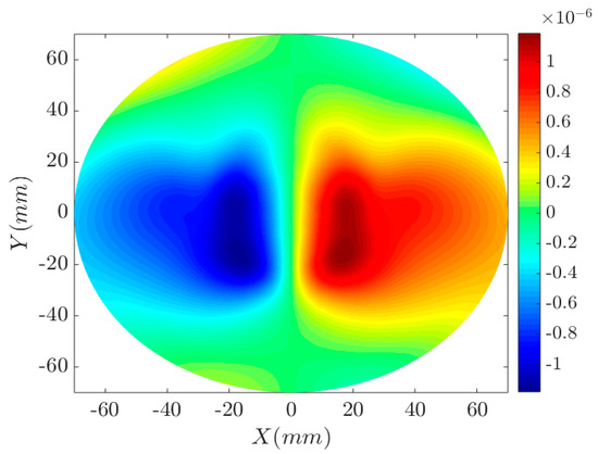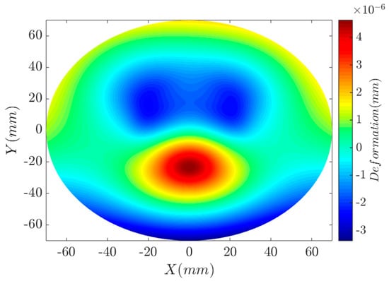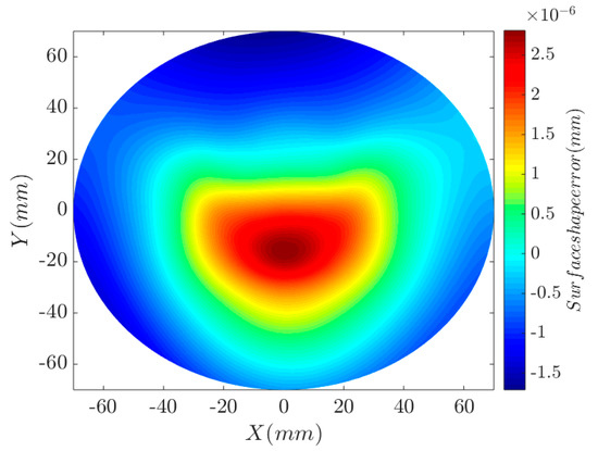 According to the obtained Pareto optimal solution set, the preferred optimal solution could be selected based on the weight of two objectives. In this case, the average surface shape error in the three directions was required to be less than 1 nm, and the total mass of the mirror was required to be as small as possible. Therefore, was chosen in the optimal solution set as the final optimization solution. At this point, the surface shape error was be obtained in three directions, respectively, as shown in Figure 5, Figure 6 and Figure 7, and the optimization parameters as well as the specific optimization results are shown in Table 2. From the results in Table 1, we can see that although the average surface shape error was less than 1 nm, there were two components that were more than 1 nm, which were . The surface shape error in the Y direction () was the biggest of those in the three directions due to the effects of gravity. After removing the rigid-body motion, the aberrations in X direction were much smaller than those in the other two directions.