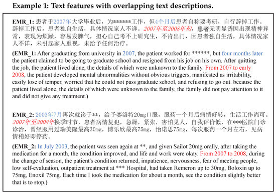 - Viani, N.; Kam, J.; Yin, L.; Bittar, A.; Dutta, R.; Patel, R.; Stewart, R.; Velupillai, S. Temporal information extraction from mental health records to identify duration of untreated psychosis. J. Biomed. Semant. 2020, 11, 2. [Google Scholar] [CrossRef]