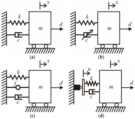 Active vibration control systems use actuators, sensors, and controllers to directly suppress vibration in the system [10]. Actuators must be able to provide the desired force or displacement to the system, depending on the type of actuator. Sensors are used to detect motion in systems involving acceleration, velocity, or relative displacement. The controller calculates the required external force or displacement using control algorithms and sends a signal to control the actuator. The controller can be either an analog circuit or a digital controller. Depending on the position of the actuator, there are two types of active control. Figure 1c shows an actuator installed parallel to the damper and spring, whereas Figure 1d shows an actuator installed in series with the damper and spring.