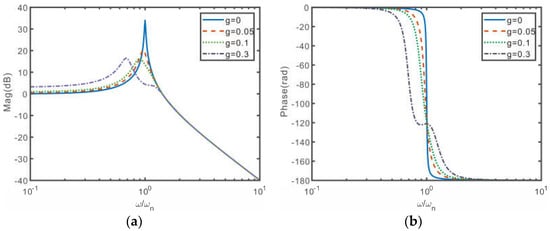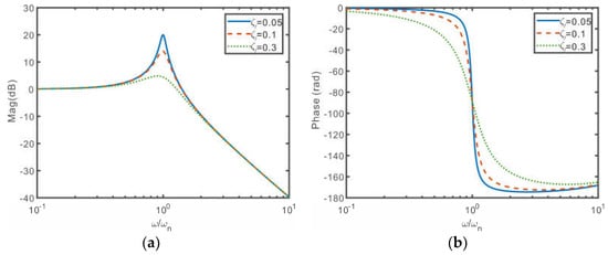 Figure 2 shows the Bode diagram of the PIPO controller for various , where are used. The magnitude plot shown in Figure 2a shows the typical second-order low-pass filter, whereas the phase plot shown in Figure 2b indicates that the phase at the filter frequency is 90 degree, which implies active damping. Hence, it can be said that the control algorithm given by Equation (5) can affect the system by increasing the damping at the target frequency. It is desirable to give the proposed control algorithm a larger frequency band. So, it seems preferable to use as in the case of the PPF controller.